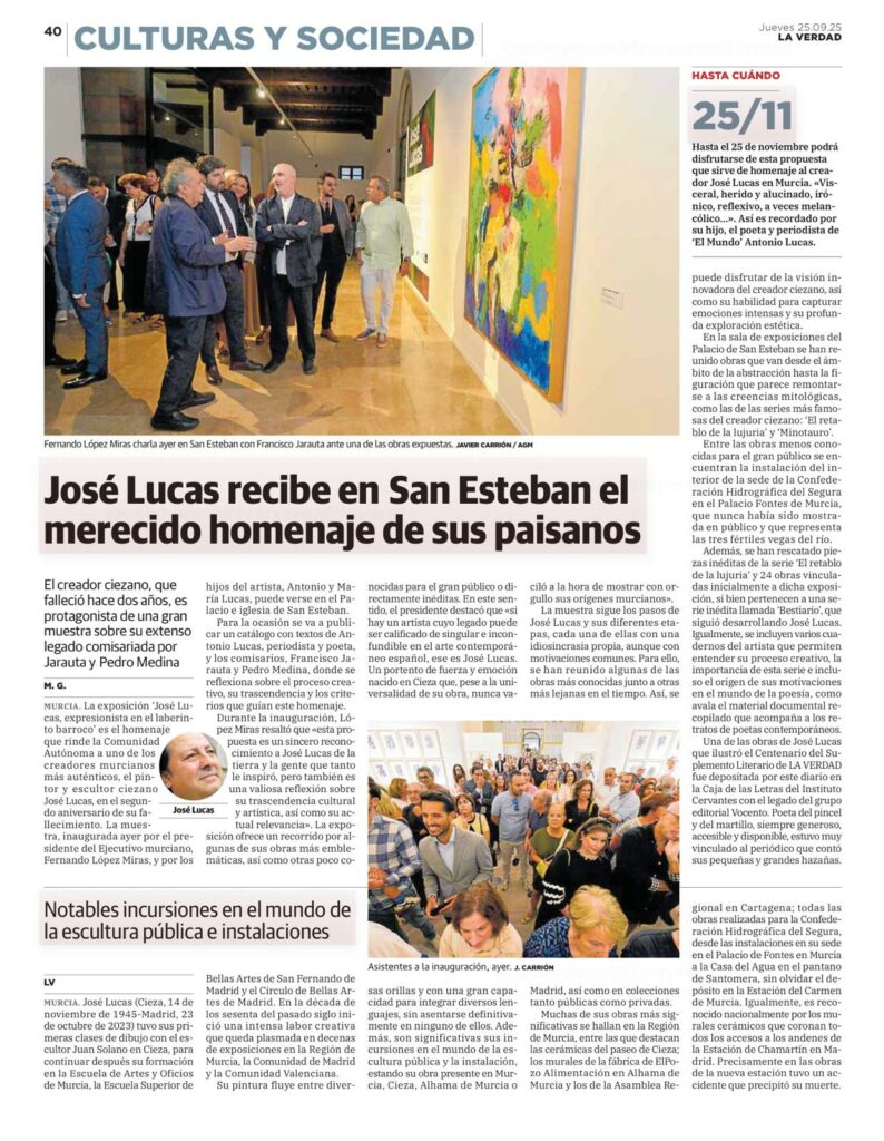 El Palacio de San Esteban presenta la exposición José Lucas, expresionista en el laberinto barroco, que conmemora el legado artístico de José Lucas cuando se cumplen dos años de su fallecimiento. Su obra, marcada por una originalidad conmovedora y una versatilidad que cruza las fronteras estilísticas convencionales, lo afirma como un creador cuya voz es única, no pudiendo reducirse a una corriente o movimiento concreto.