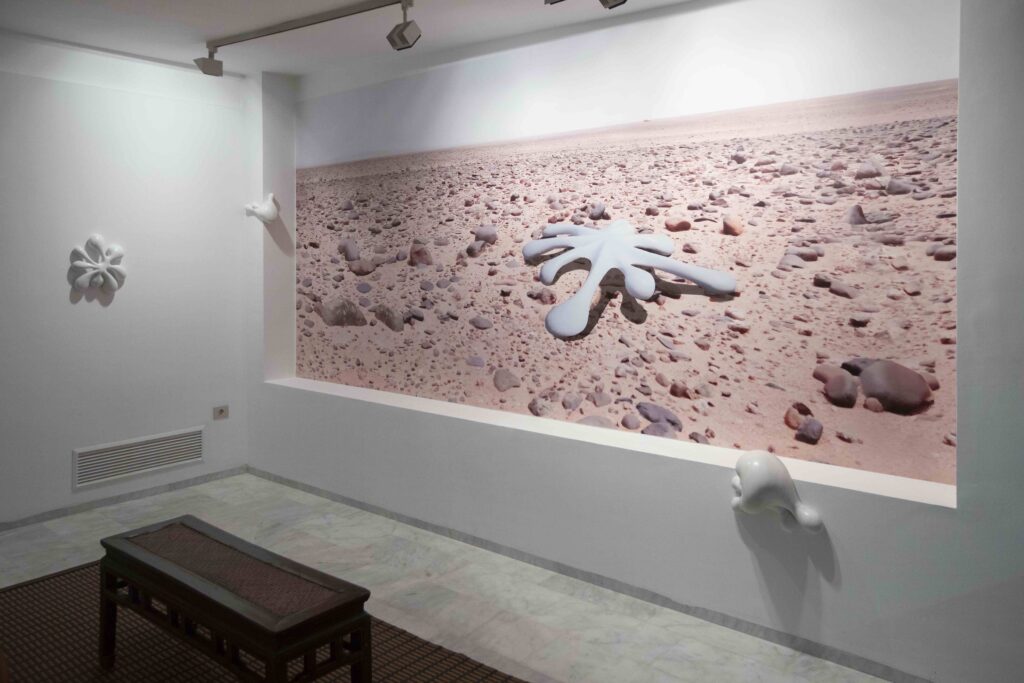 Como consecuencia de esta experiencia casi mística, han sentido la necesidad de delimitar las piezas en la galería por medio de dos ambientes naturales: uno, en efecto, un bosque gallego –del que sale un elemento natural– y, otro, un paisaje desértico lleno de rocas, como los extremos de una misma realidad.